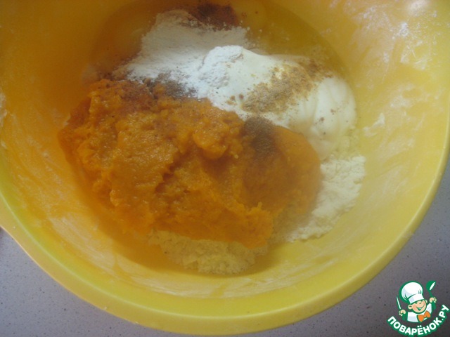 В оставшиеся 2/3 крошки добавляем тыквенное пюре (для его приготовления тыкву очищаем, нарезаем кусочками, укладываем в форму для выпечки и запекаем в духовке, даем остыть, перебиваем блендером до состояния пюре), сметану, яйца, корицу, мускатный орех, имбирь и разрыхлитель теста.
