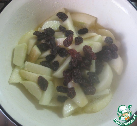 Добавляем очищенные и нарезанные кусочками яблоки, аккуратно перемешиваем. Добавляем промытый и просушенный бумажной салфеткой изюм. Томим все вместе на маленьком огне 3-4 минуты, аккуратно переворачивая яблоки.
