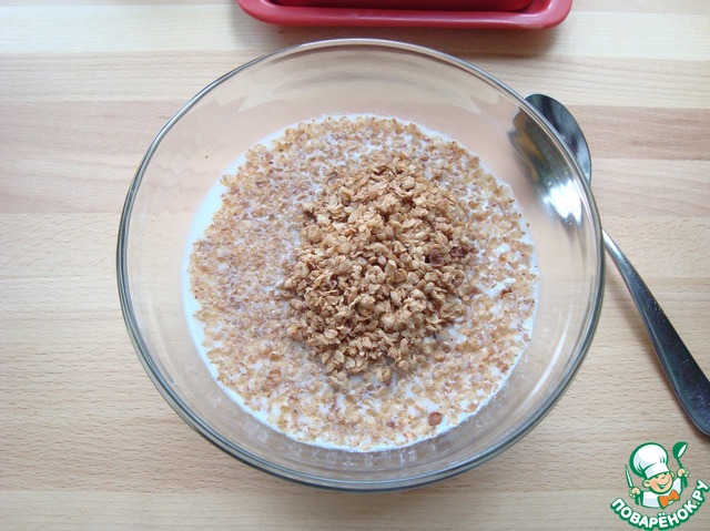 Греем молоко, насыпаем в него хлопья и даём разбухнуть минут 5, чтобы получилась каша густая. Можно кашу гречневую сварить.