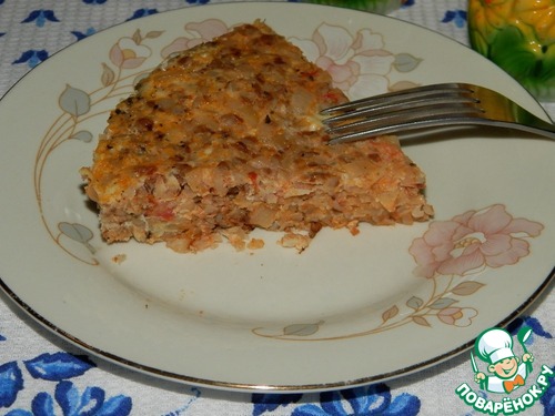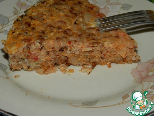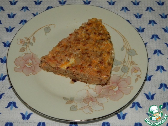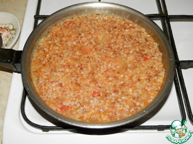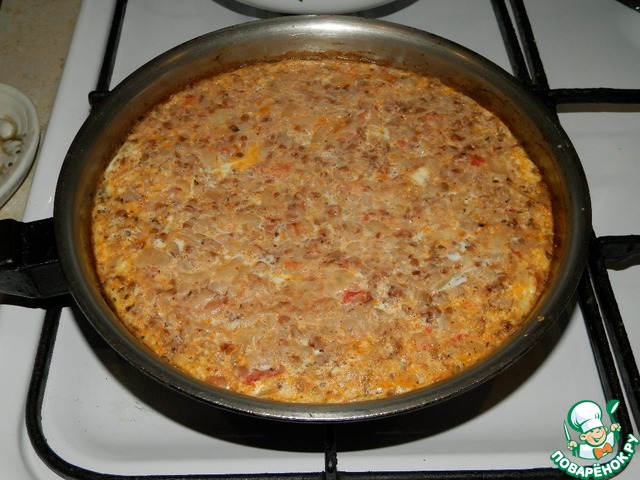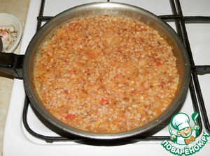 Отваренную гречку выложить к овощам, залить яичной смесью и перемешать.