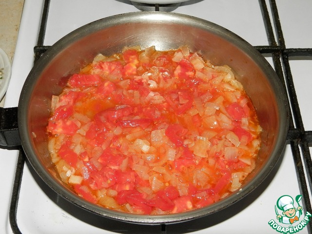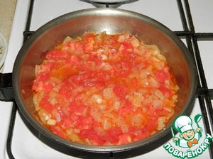 С томатов снять кожицу, порезать кубиками и добавить к луку. Тушить минут 5.