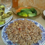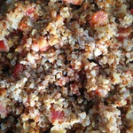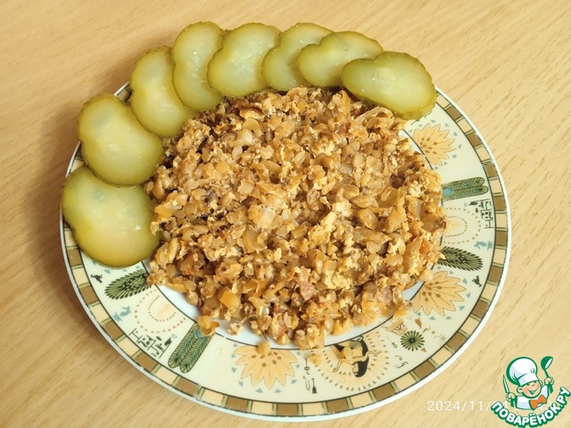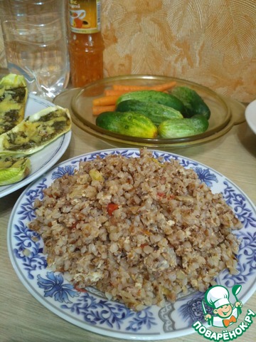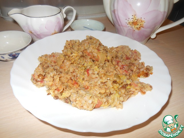 Всё это на электрической плитке минут пять шкварчало и брызгало в разные стороны. Всыпалась варёная гречка и, туда разбивались штук 5 яиц. Эта масса густо посыпалась перцем, солью и специями. Быстрым движением руки смесь хорошо размешивалась, накрывалась крышкой на 5 минут.