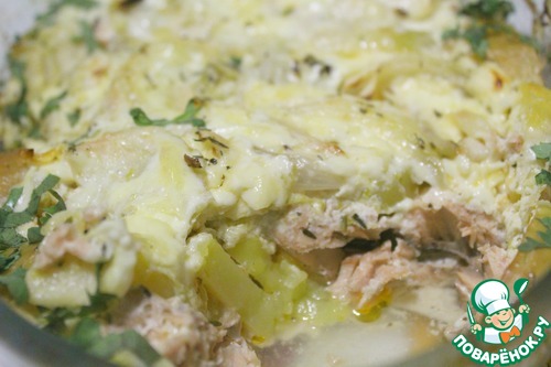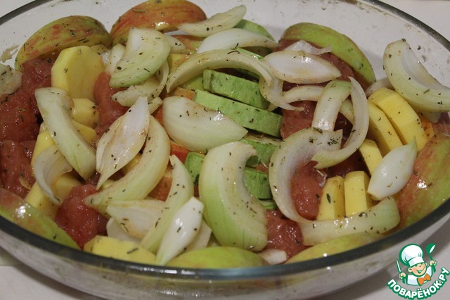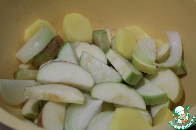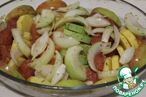 Форму смазать оставшимся маслом и выложить рыбу, овощи и яблоки - я выкладывала рядами: ряд рыбы, ряд картошки, ряд яблок и тд, кроме лука - лук я распределила сверху, как бы прикрыла.