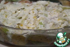 Распределить йогуртовую заливку сверху, особенно хорошо смазав рыбные ряды. -