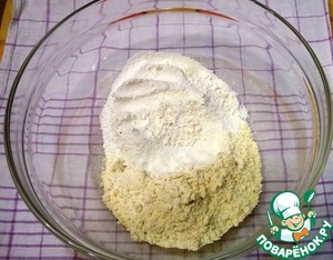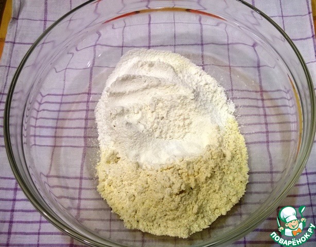 Просеиваем оба вида муки и смешиваем их с разрыхлителем, ванилином и солью.