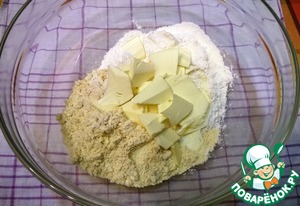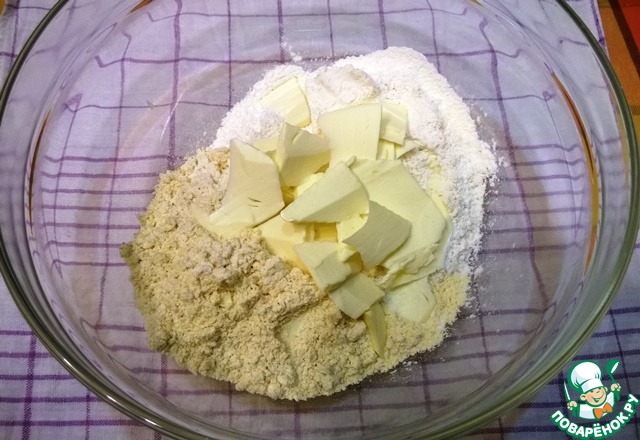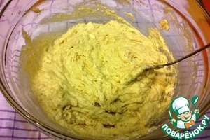 Добавляем кефирную смесь в мучную и перемешиваем, не стараясь добиться полной однородности – небольшие кусочки масла должны быть видны.