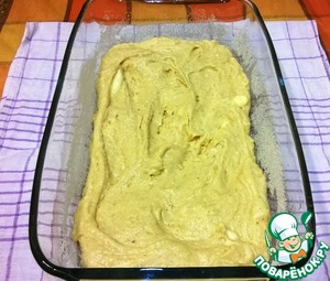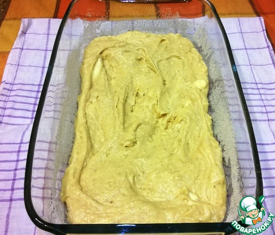 Готовим форму: смажем маслом и посыплем мукой или манной крупой, стряхнув излишки. Силиконовую можно просто ополоснуть водой. Форма у меня 20 х 30 см. Выкладываем тесто.