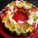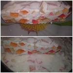 5. Добавляем в сметану разноцветные кусочки желе, перемешиваем и заливаем в слегка смоченную водой формочку.