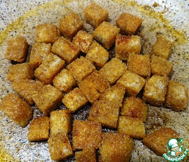 Хлеб нарезается кубиками и обжаривается в растительном масле с чесноком и паприкой. Можно переложить в отдельную емкость, чтобы освободить место для яйца, а можно обжарить вместе с последним.