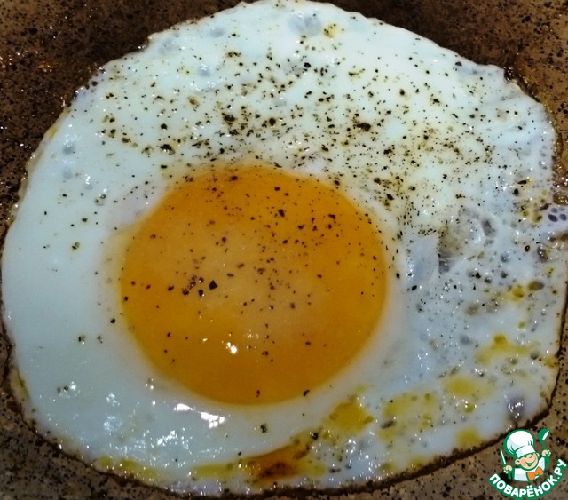 На сыр выкладывается глазунья, гренки и немного лука для украшения.