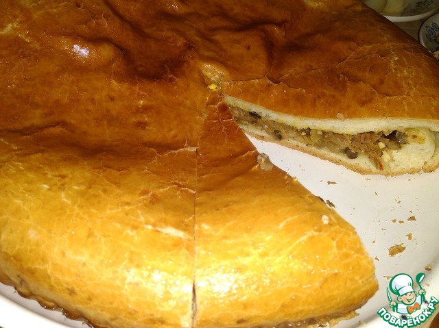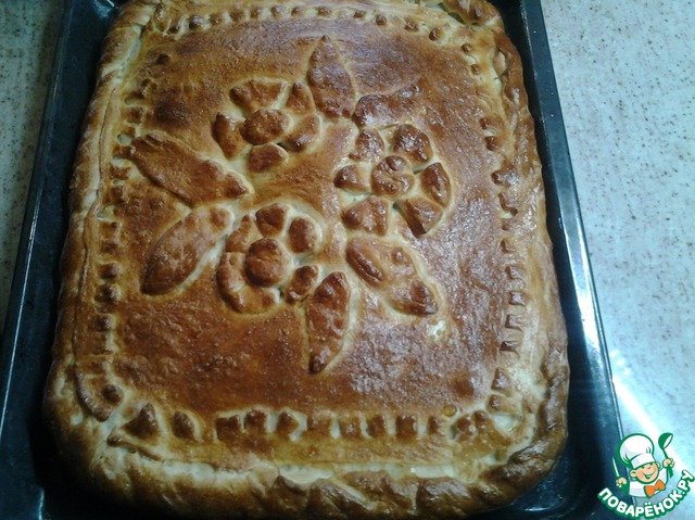 Собираем пирог. Раскатываем большой колобок. Пласт теста переносим на скалке на противень, смазанный предварительно любым маслом. Выкладываем на тесто начинку, накрываем вторым пластом теста и защипываем пирог. Сверху украшаем, как можем, пирог оставшимся тестом. В русской кулинарной традиции пирог должен быть не только вкусным, но и красивым.