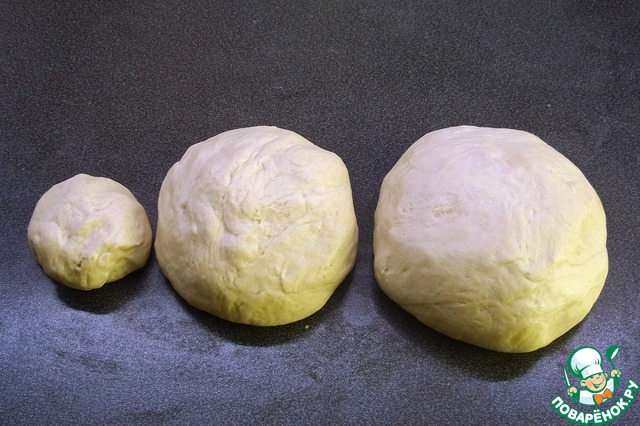 Тесто готовим опарным способом. Смешаем в кастрюле молоко, воду, дрожжи и половину сахара. Добавим часть муки - 250 г. Ставим опару в тёплое место. После того, как она подойдёт, добавляем в тесто соль, масло, яйцо, оставшуюся муку и сахар. Вымешиваем тесто в течение 5 минут, при необходимости добавляем муку (до "отлипа"), но делаем это осторожно - тесто должно остаться мягким, податливым. Накрываем тесто перевёрнутой кастрюлей и оставляем тесто в покое на полчаса. Убедившись, что тесто ожило и заметно подошло, делим его на три колобка - один большой, другой поменьше а третий - совсем маленький. Помните сказку про трёх медведей?