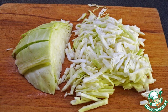 Пока тесто подходит, надо успеть сделать начинку. Капусту нарезаем довольно мелко. Кипятим в большой кастрюле два литра воды. Подсаливаем воду и высыпаем туда капусту. Варим ровно 7 минут с момента закипания. Сливаем воду и оставляем капусту остужаться.