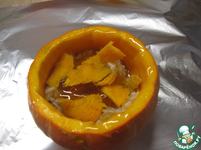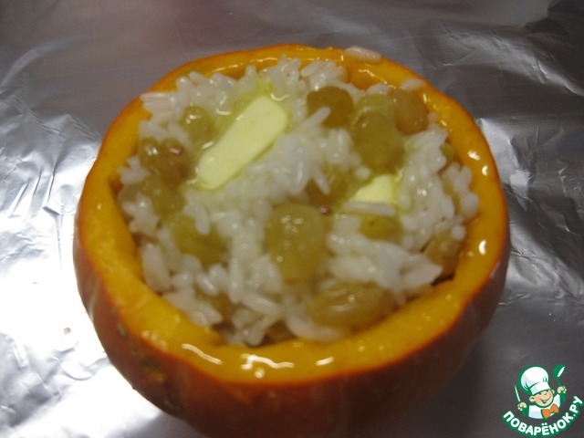 • Тем временем рис сварился, смешаем его с изюмом, и наполним тыкву наполовину, на кашу выкладываем немного мякоти тыквы и немного джема. Тут тыква уже на фольге, в которую потом ее запакуем)