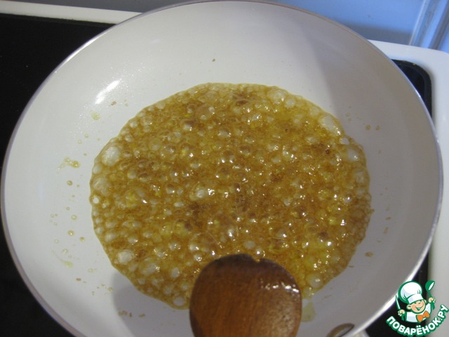 Для этого на сковороду насыпаем сахар, ждем когда начнет плавится и добавляем кусочек сливочного масла, доводим до золотистого цвета и аромата карамели) минут 5