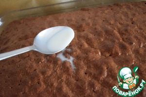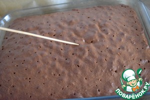 Вынимаем пирог из духовки. Даём 10 минут "отдохнуть". Затем деревянной лучиной наносим частые "уколы" по всей поверхности пирога.