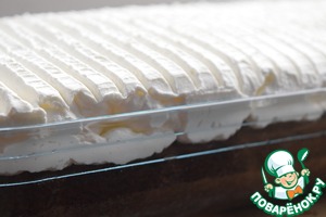 Наносим взбитые сливки на пирог, разравниваем. Я "прошлась" для пущей красоты ещё и шпателем.