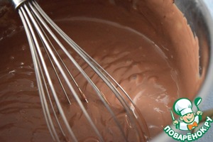 Перед закипанием (не доводя до кипения) снять сразу с огня и ввести поломанный на кусочки шоколад, тщательно перемешивая до полного растворения шоколада. Накрыть поверхность пищевой плёнкой, дать остыть.