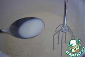 К яичной массе добавляем жидкие ингредиенты - 2 ст. л. молока и 2 ст. л. растительного масла. Перемешать - я взбила вновь, до воссоединения.