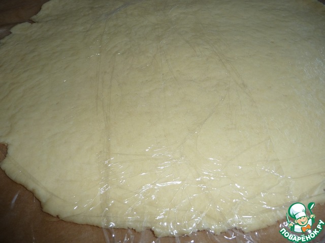 Тесто достать из холодильника, раскатать на пекарской бумаге в пласт толщиной 0,5-0,7 см., для удобства раскатки на тесто положить пищевую пленку.