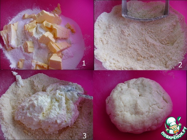 Масло порезать кубиками, смешать с мукой до образования крошек.