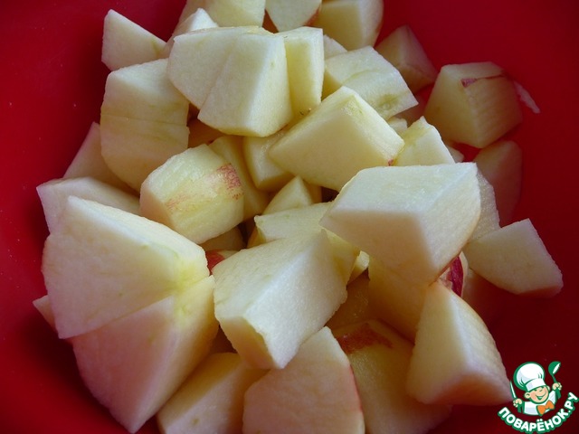 Для начинки, яблоки помыть, почистить, порезать на кубики, сбрызнуть соком лимона.