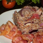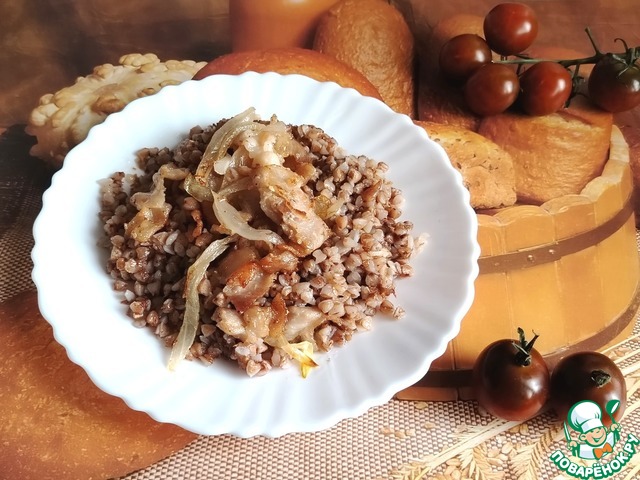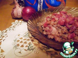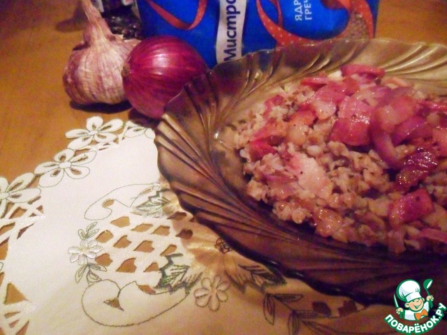 Так накануне получки сыночка меня "обрадовал": "Мам, мы едем к КВНу готовиться!" Я поняла, что мне обеспечена толпа голодных молодых людей. Хлеб я купила, бекон, чеснок и лук лежали в холодильнике. А почему бы и не попробовать рецепт из журнала?" "Просто вкусно" меня не подводил. Посмотрела, прикинула. Гречки хватало. Одна беда - не все едят кашу. К чаю испекла ""Шарлотку по-питерски" и решила, что кто не будет кашу, тот "догонится" шарлоткой.