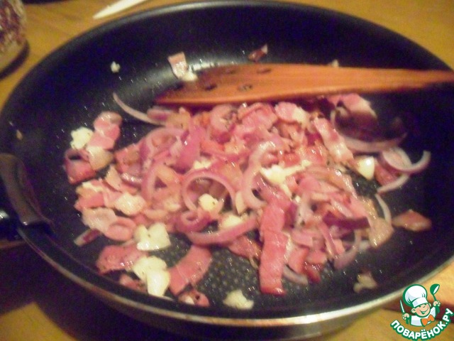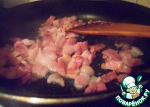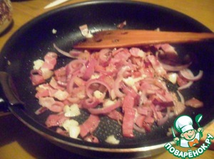 Выложить бекон на сухую сковородку и обжарить до прозрачности. Добавить лук. Жарить до изменения цвета последнего.