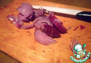 Лук очистить и нарезать полукольцами. Бекон нарезать ломтиками.