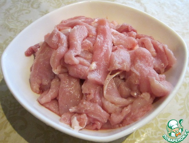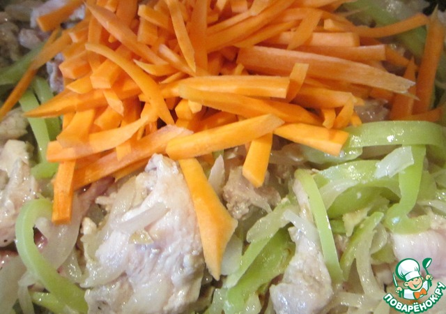 Выкладываем свинную лапшу на сковороду. Перемешиваем все и повторяем уже известный фокус (3-5 мин).