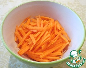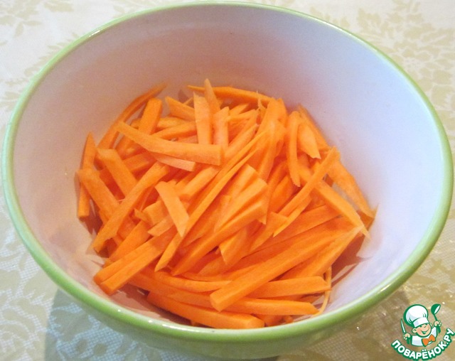 • Отправляем на сковороду морковную лапшу. Перемешиваем.