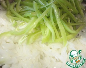• Затем добавляем перец. Перемешиваем все и проделываем тот же фокус, что и с луком (3-5 мин).
