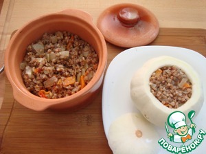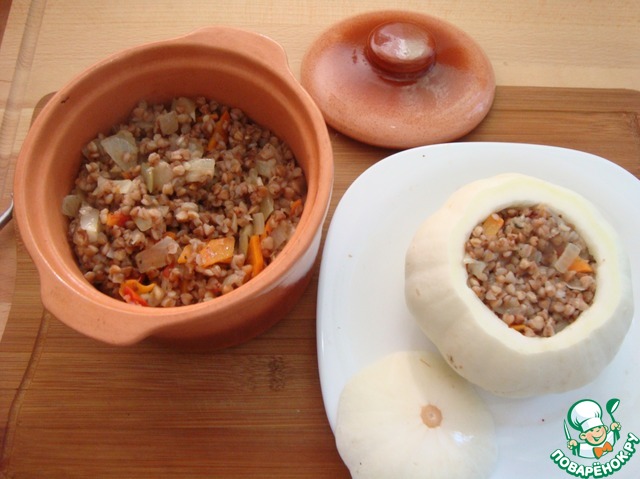 Гречневая каша с овощами: патиссоном (кабачком), морковью, помидором, луком и чесноком. Кашу можно запечь в горшке или в патиссоне с шампиньонами и сыром. Я так и сделала сегодня.
