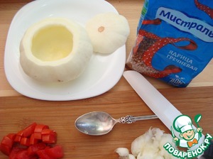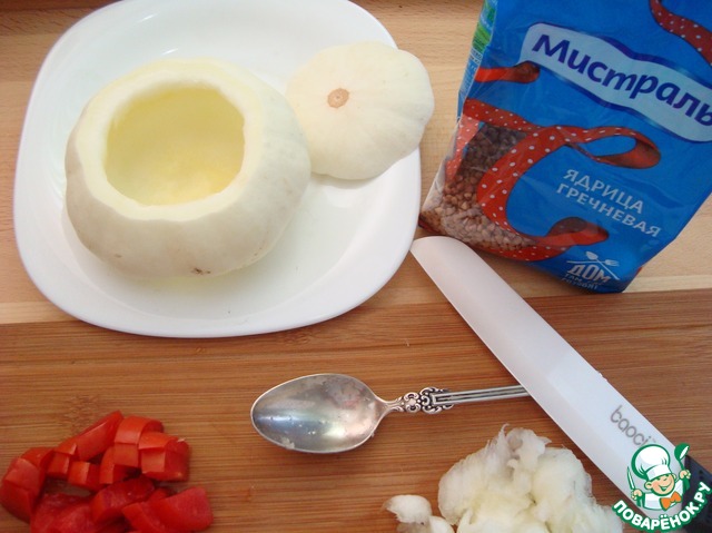 Ставим варить кашу гречневую, согласно инструкции на упаковке. Для каши я взяла патиссон. Срезала "крышечку" и вынула мякоть из патиссона. Сделала такой горшочек. Оставила мякоть.