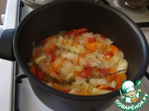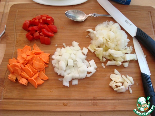 Овощи порезала мелким кубиком. То, что вырезала из патиссона- мякоть, тоже порезала.