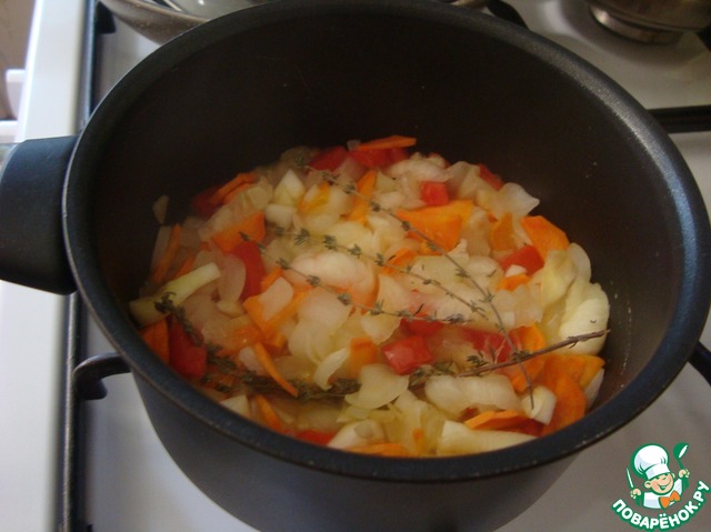 На сковороду наливаем масло и выкладываем лук с чесноком. Золотим. Отправляем все овощи. Делаем минут 5 и кладём веточки тимьяна и орегано, солим. Всё перемешиваем и доделываем почти до готовности овощей минут 15. Вынимаем веточки тимьяна. Можно добавить сухой тимьян, если нет веточек.