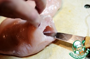 • В толстой части куриной грудки острым ножом сделать углубление, как бы кармашек.