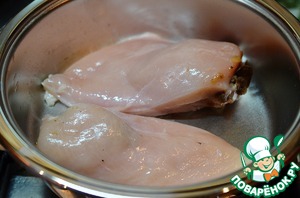 • Сковороду разогреть для жарки до эффекта "жемчужины", положить куриные грудки.