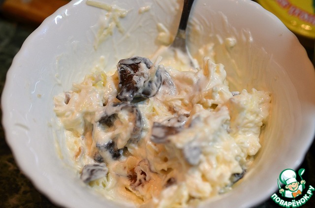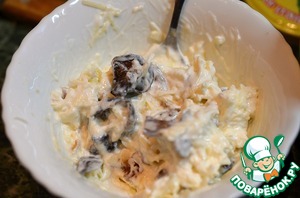 • Для соуса смешиваем сметану, оставшиеся грибы, нарезанный чеснок и тертый сыр.