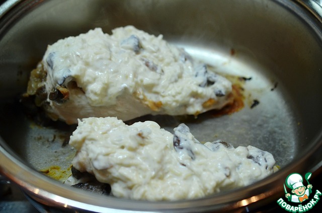 • На каждую грудку выкладываем соус, выключаем плиту и накрываем крышкой. Через 10 минут грудки готовы.