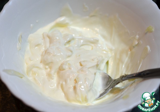Для соуса смешиваем сметану, оставшийся натертый сыр и нарезанный чеснок.