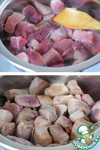 Выкладываем мясо и обжариваем его 2-3 мин. до румяной корочки.