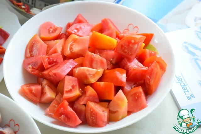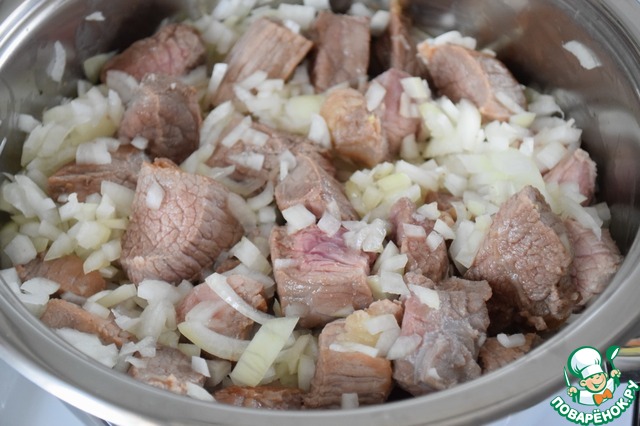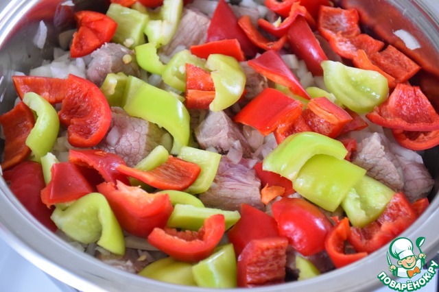 Мясо нарезать крупными кусочками, лук - кубиком, перец - крупными кусочками.