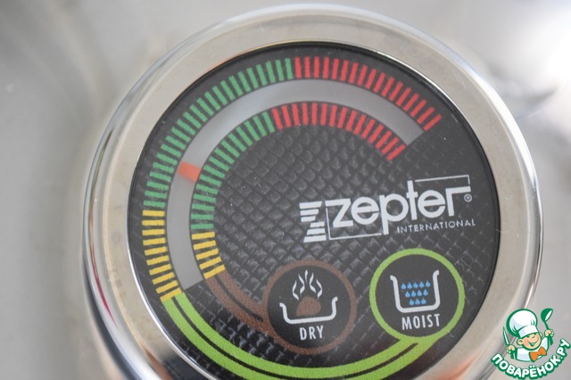 Сотейник закрываем крышкой и на среднем огне нагреваем его до начала зеленого сектора на термоконтроллере (наблюдаем по внутренней шкале) - это свидетельствует о том, что сотейник нагрелся до нужной температуры, и можно начинать готовить.