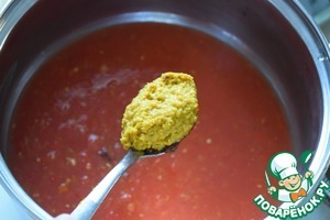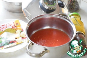 Приготовить подливу: перемолоть помидоры, болгарский перец (можно взять готовый томатный сок, но с домашним намного вкуснее).