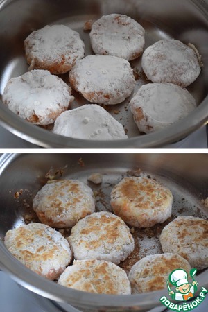 Формируем небольшие круглые котлетки (как сырники), панируем в муке. Из этого количества фарша у меня получилось 19 котлет.