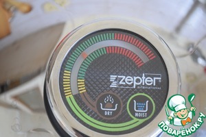 Сотейник накрываем крышкой и разогреваем его до начала зеленого сектора (смотрим по внутренней шкале). Можно также проверить, нагрелся сотейник или нет, если налить немного воды - капельки должны раскатываться, как шарики.