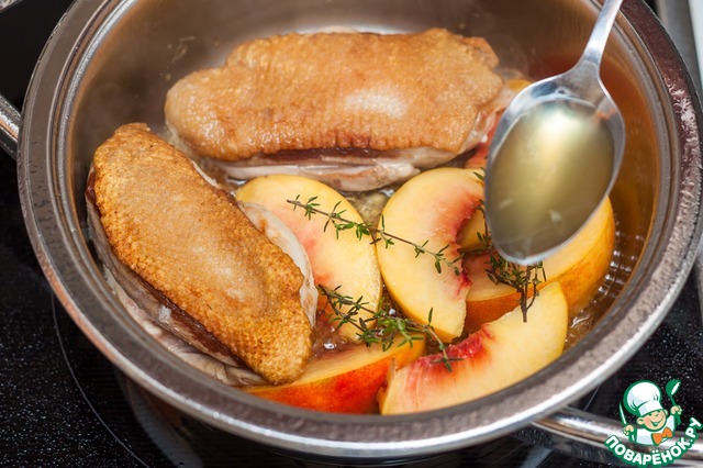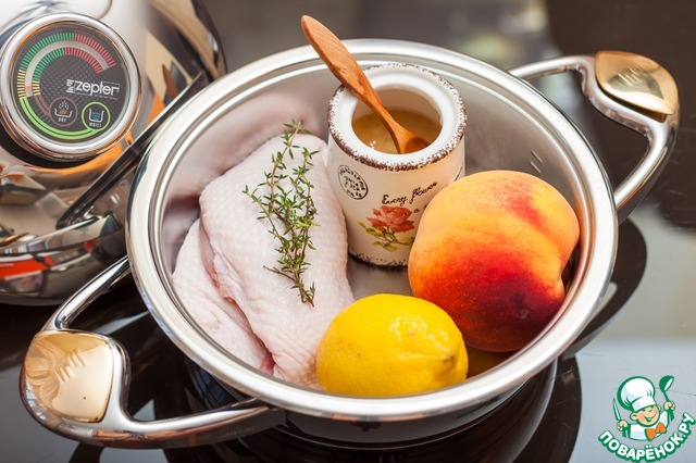 Переверните грудки на одну половину кастрюли, а рядом положите нарезанные дольками персики и веточки тимьяна. Полейте персики лимонным соком, смешанным с медом. Накройте кастрюлю крышкой, убедитесь, что стрелка термоконтроллера находится чуть дальше, чем середине пути и снимите с огня. Все! Теперь грудки будут запекаться без нагрева и участия человека.