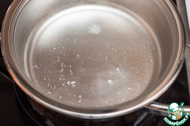 В посуде Zepter готовят разными способами - можно продукты закладывать в холодную кастрюлю, можно в горячую. Обо всех способах я подробно расскажу в след. рецептах, а сейчас нам надо поджарить утиную грудку, поэтому ставим кастрюлю на максимальный огонь и ждем, пока она хорошо разогреется. Узнать, что посуда достаточно нагрелась, очень просто - применяем эффект жемчужины, т. е. если плеснуть ложку воды, по дну начинают перекатываться капли воды, как на этом снимке.