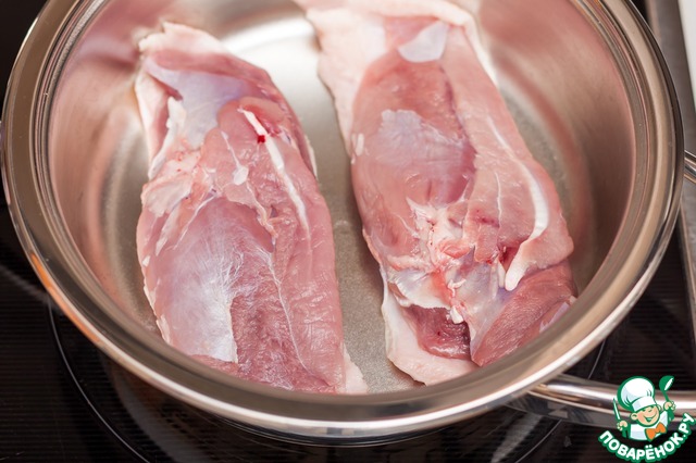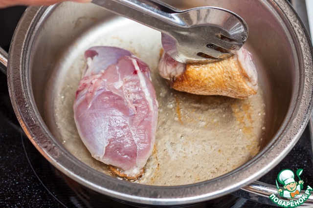 Уменьшите нагрев до среднего. Утиные грудки обмыть, промокнуть салфеткой и аккуратно положить на дно, хорошо прижимая вилкой. Масло не добавляем! Не солим! Мясо зашипит и намертво прилипнет, поэтому выкладывайте осторожно, передвинуть кусок вы уже не сможете до тех пор, пока эта сторона не прожарится.